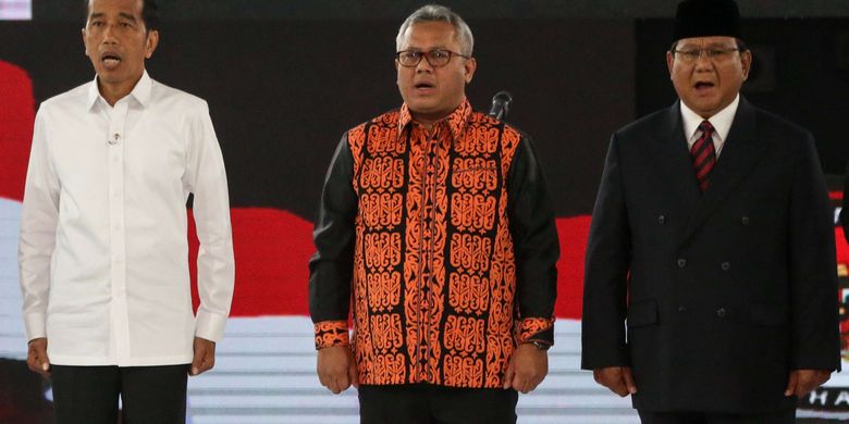 Refleksi Pemilu 2019 Sebanyak 894 Petugas KPPS Meninggal Dunia. Calon presiden nomor urut 01 Joko Widodo kiri Ketua KPU Arief Budiman tengah dan Calon presiden no urut 02 Prabowo Subianto memaparkan pada Debat Keempat Calon Presiden Pemilu 2019. DetikNews Jumat 12 Jul 2019 1050 WIB KPU Beri Santunan ke 10 Keluarga KPPS yang Meninggal Usai Pemilu.
